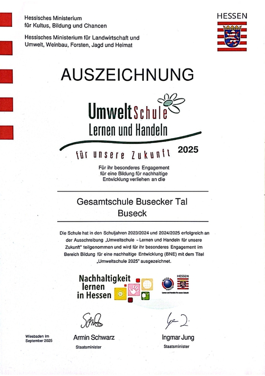 Die IGS Busecker Tal wurde zum wiederholten Mal mit dem renommierten Titel „Umweltschule“ ausgezeichnet. Staatssekretär Dr. Manuel Lösel übergab gemeinsam mit Marc Schäm als Koordinator unserer Region aus dem Holz- und Technikmuseum in Wißmar die Urkunde in einer feierlichen Zeremonie an die beiden Lehrkräfte Herrn Kupfer und Herrn Schumann.