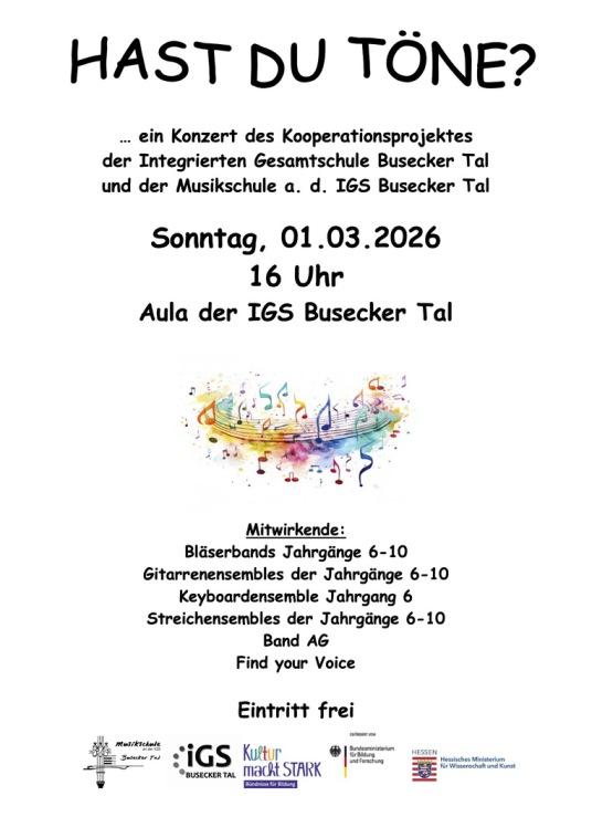 Die gute musikalische Bildungsarbeit an der Gesamtschule Busecker Tal wurde am 07.03.2024 durch das hessische Kultusministerium gewürdigt. Hierzu hatte das Hessische Ministerium für Kultur, Bildung und Chancen eingeladen. Während der landesweiten Zertifizierungsfeier der „Schulen mit Schwerpunkt Musik“ im Dr. Hoch’s Konservatorium in Frankfurt am Main, wurden insgesamt 99 hessische Schwerpunktschulen dafür gewürdigt, dass sie die Schülerinnen und Schüler an ihren Schulen „in besonderer Weise bei der musikalischen Bildung fördern“.